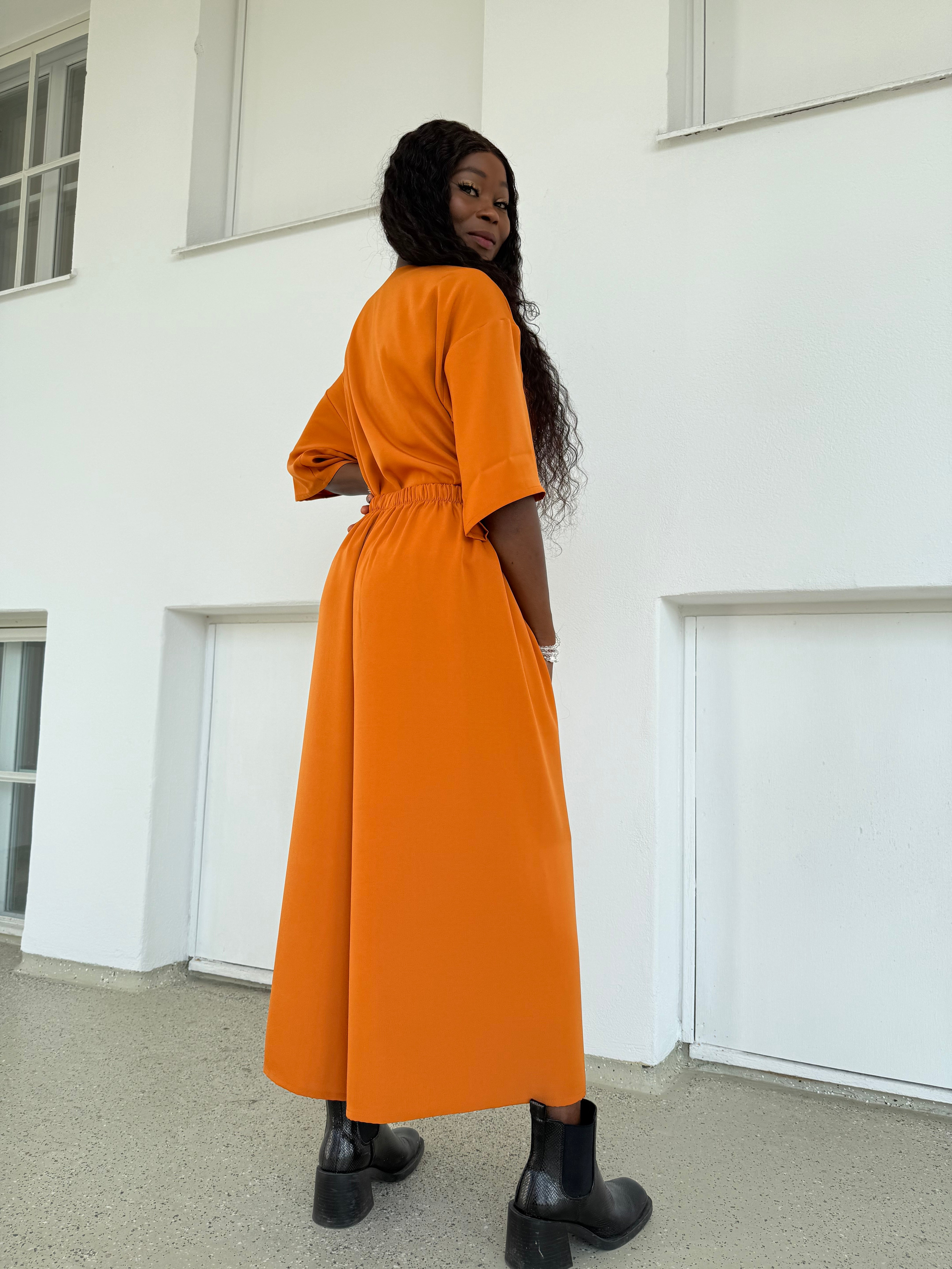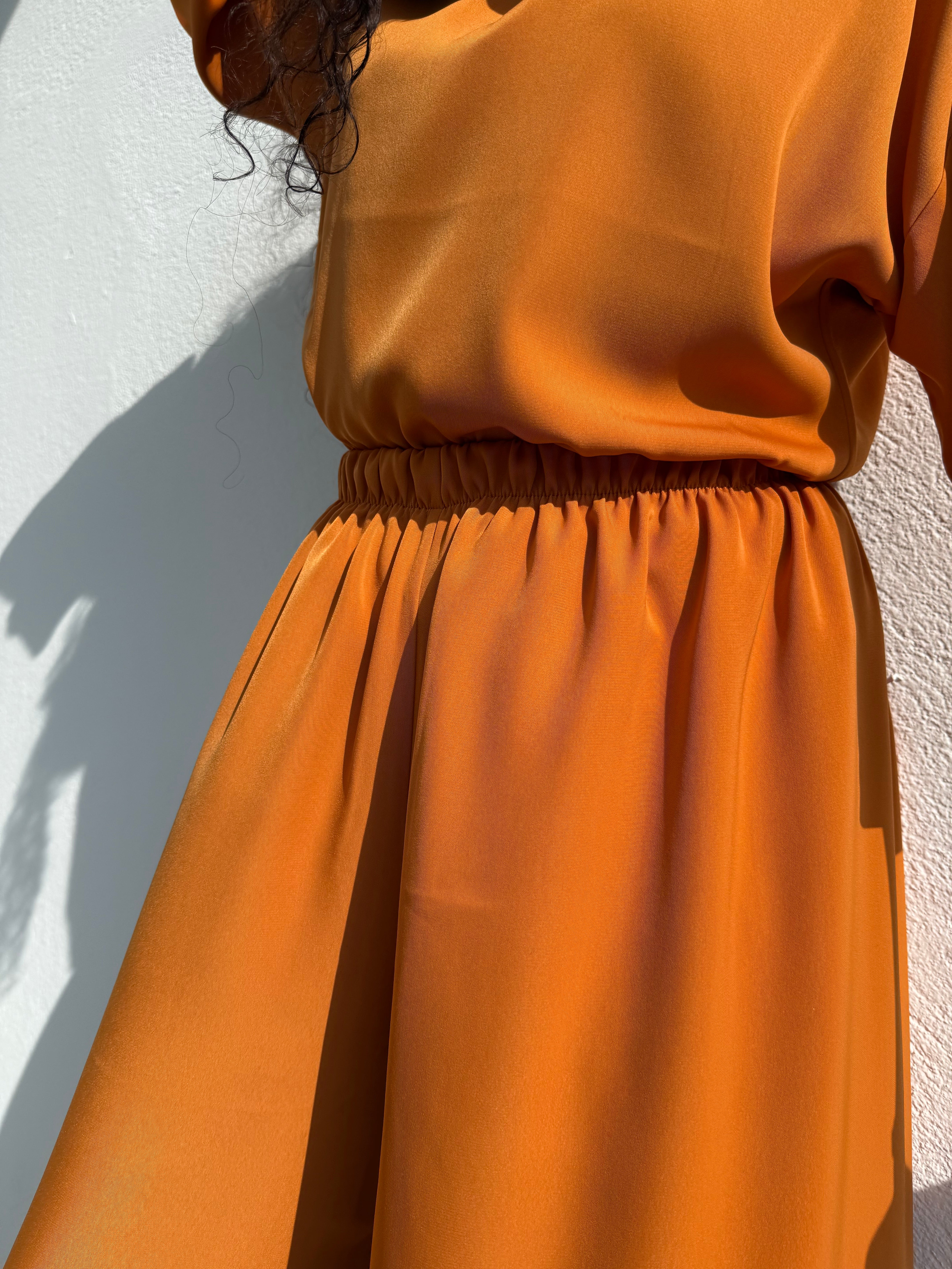 Kangas ei juurikaan rypisty joten pesun ja kuivumisen jälkeen voit huoletta pukea Sointu housuhameen yllesi ilman silitystä. Okran sävyinen materiaali on tunnultaan kuin kupro tai pehmeä viskoosi.